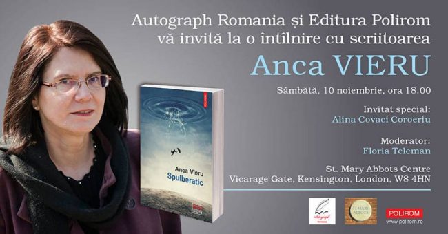 Sâmbătă, 10 Noiembrie, de la ora 18.00, in sala de confetinţe a Centrului St.Mary Abbots din Kensington, Vicarage Gate, W8 4HN, Alina Covaci Coroeriu ne va vorbi despre romanul Spulberatic, al Ancăi Vieru. Vă aşteptăm cu drag. Anca Vieru s-a născut și locuiește în București, însă orașul ei de suflet este Brașovul, unde și-a petrecut…